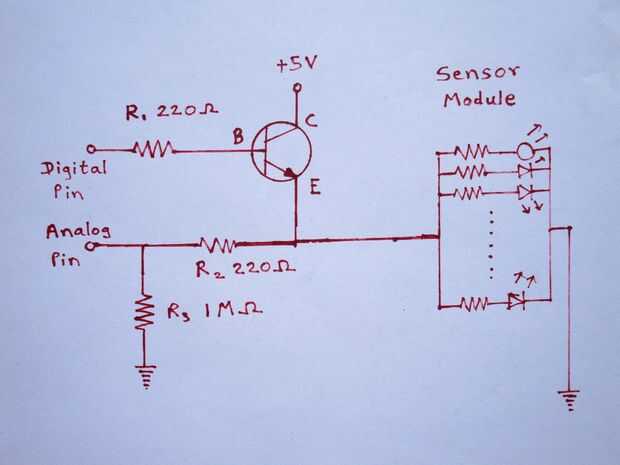 Ahora encenderse los LEDs, tenemos que estos LEDs de potencia. Para ello conecté una conmutación transistor 2N2222 como se muestra en la figura. La Base está conectada al pin de salida digital del arduino. Cuando es alta transistor dará fuente de 5V a panel LED. Para limitar la corriente a los LEDs, conectados resistor de 220 ohmios para cada LED. (Cada uno - ya no habrá problema si un LED corriente más y otros menos) Tan cada LED tendrá la misma corriente de sobre B11. También limitar el suministro del pin digital de arduino conectado resistor de 220 ohmios (R1) en serie entre la base y el digital.