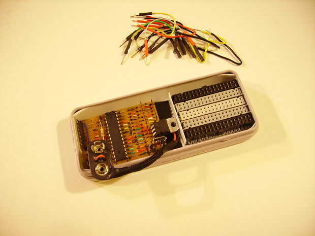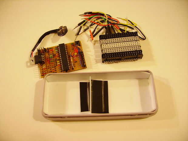 También caben en componentes como todavía hay espacio en la lata, una bolsa de ziplock pequeñas encajaría muy bien en el protoboard y el tablero de 168 si su embalado plano bastante.
