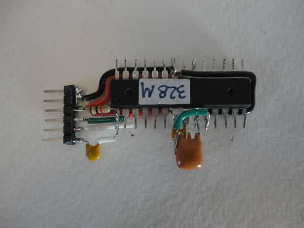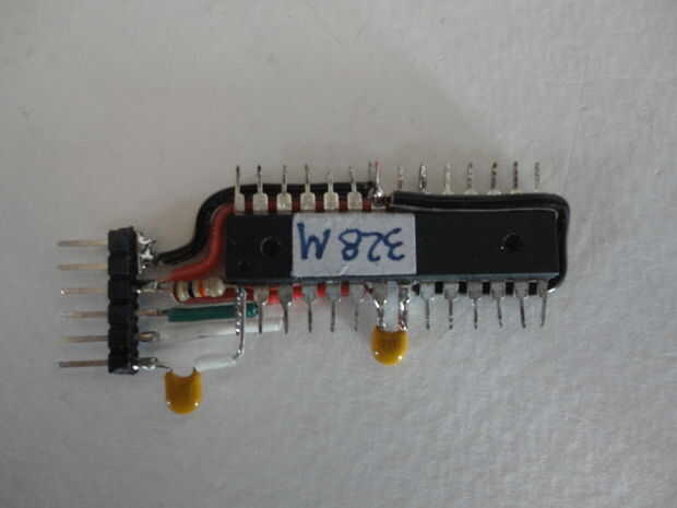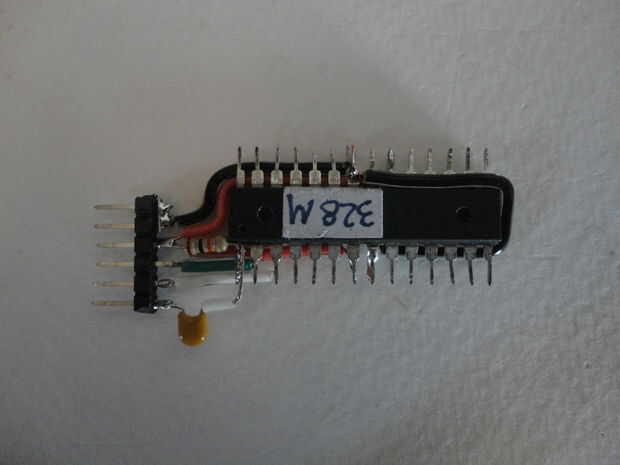 Luego que soldados 0.1uF condensador horizontal a patillas #7 y #8 en el micro controlador. (Foto 2)