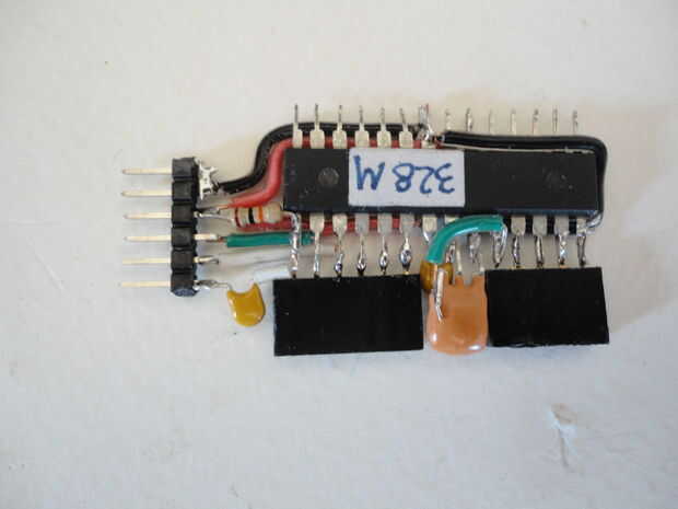 Soldado 1 x 14 receptáculo hembra para pines 9, 10, 11,..., 26, 27, 28 de ATMega328P respectivamente.