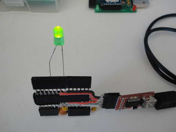 Más tarde decidí añadir 3mm LED de prueba, por puesto horizontalmente. Conecta pin positivo (+) del LED al pin GND del conector macho de 6 pines, FTDI y conectado pin negativo (-) del LED a la resistencia de 1 K. Y he conectado el otro cable de resistencia de 1K conectada al pin #19 (D13) de ATMega328P (cuadro 5).