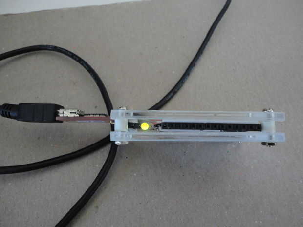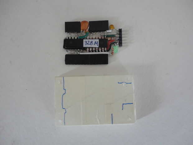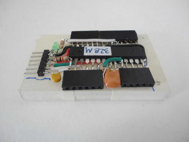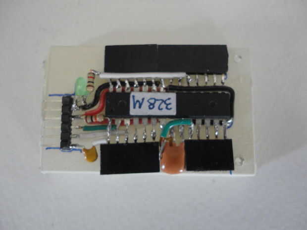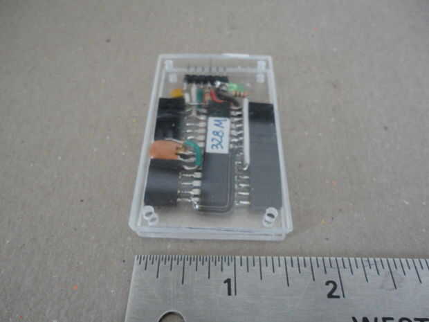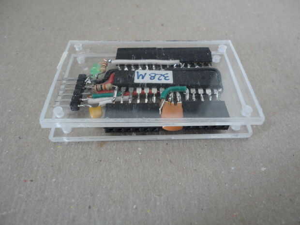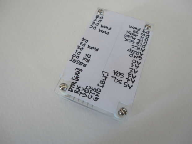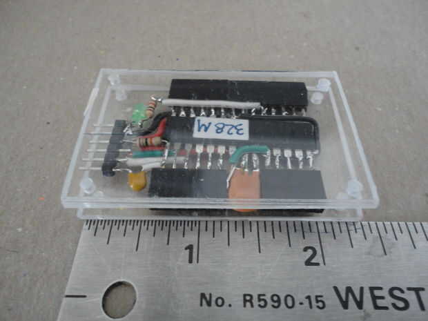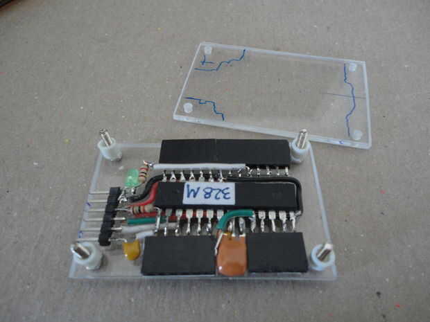 Y he instalado los cuatro tornillos 2-56 desde la cubierta inferior. A continuación, inserta los separadores, recortado la altura de los separadores que aproximadamente a la altura del cuerpo del ATMega328 antes de cerrar la tapa con las tuercas hexagonales de 2-56.
