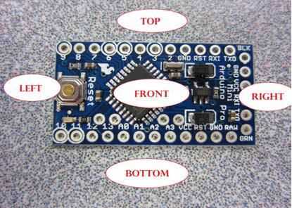 Miren el Arduino y familiarizarse con el vocabulario de orientación utilizado en estos pasos. Este proyecto utiliza el Arduino Mini Pro. Otras placas arduino será capaces de realizar en este proyecto pero el mini permite un diseño compacto.