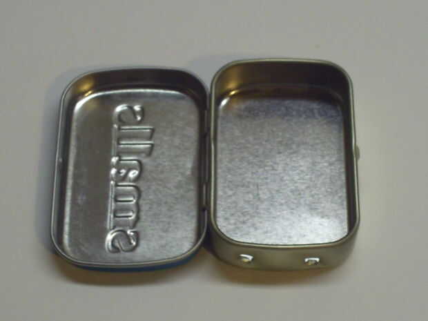 Vale, que comienzo! Comience clavando dos agujeros en el lado de la lata Altoids más pequeños. hacerlos tan bajo como sea posible, para que la parte superior no hay manera.