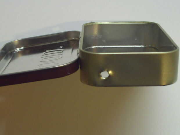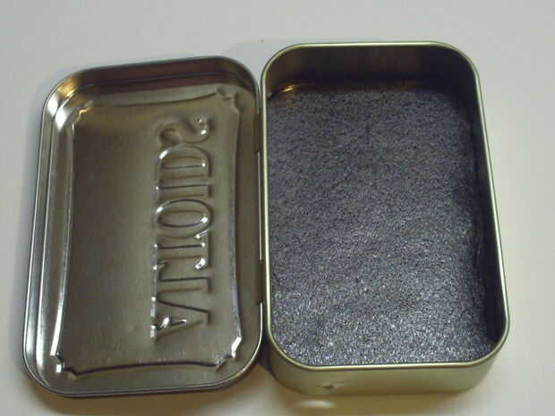 Uñas dos agujeros en la lata Altoids más grande (una a cada lado en las esquinas opuestas). Ahora corte un trozo de espuma o de goma y coloque en la parte inferior de la lata Altoids para aislarlo.