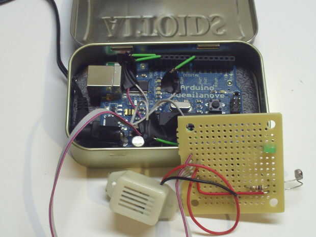 Hacer sus conexiones a los pines de Arduino, a continuación, insertarlo en la lata Altoids. Asegúrese de cortar dos agujeros en la parte superior de la lata Altoids para el zumbador y el LED. También se necesita doblar la fotorresistencia para alinearse con el agujero.