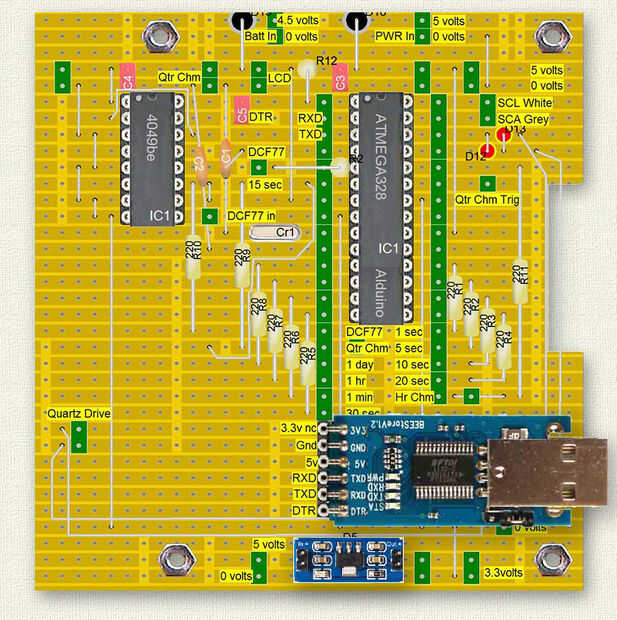 El corte a la derecha del tablero va en la parte posterior de la caja y permite el acceso de cable con tomas para todos los pines. Se incluyen salidas para habilitar feeds a otros relojes vía los conductores de transistor como sea necesario.