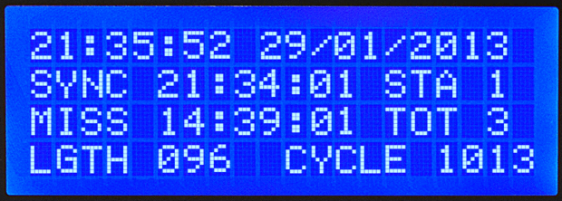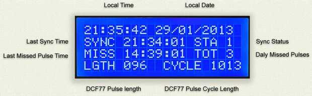Tiempo y fecha última vez que la sincronización de reloj a la DCF77 indicaría el estado de sincronización tiempo pasado el reloj perdió un pulso (y fue corregido mediante la adición de un pulso) número de pulsos perdidas en última longitud del pulso de 24 horas 100 MS = 1, longitud de ciclo de 200ms = 2 1000ms e indicador EOF (final del campo) el reloj va a apagarse la pantalla LCD después de la medianoche y se volverá a encender en el 06:00hrs. Esto puede cambiarse fácilmente si es necesario editar el código.