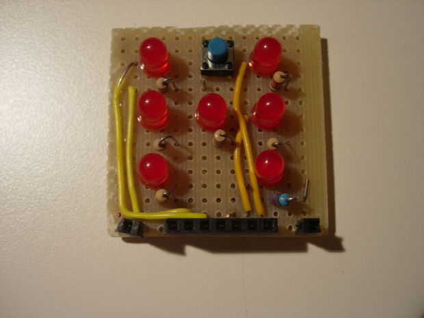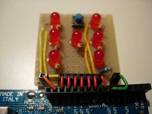 En las imágenes, hay mi vieja versión de soldadura de mi Arduino led dados, y por desgracia, en esta versión cada led se conecta a un pin del Arduino: durante la soldadura, es aconsejable conectar los LEDs en pares como en la versión de la protoboard, para mayor comodidad.
