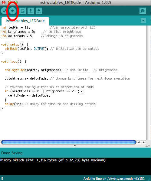 Conectar tu Arduino a un ordenador vía USB, luego seleccione la flecha hacia la derecha en la esquina superior izquierda de la ventana de esquema (un círculo rojo) para subir el dibujo y ver su desvanecimiento del LED.
