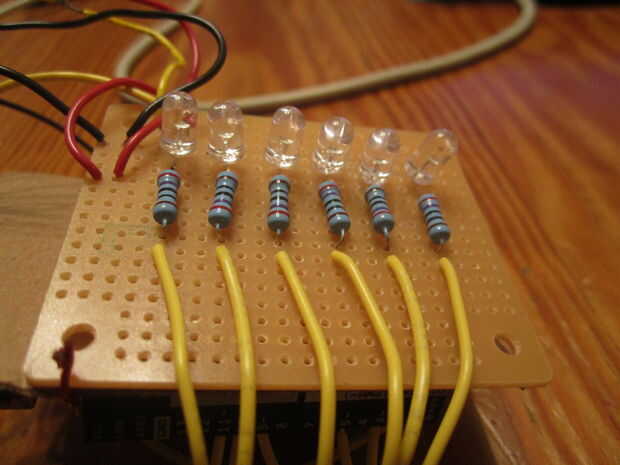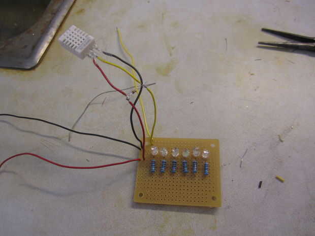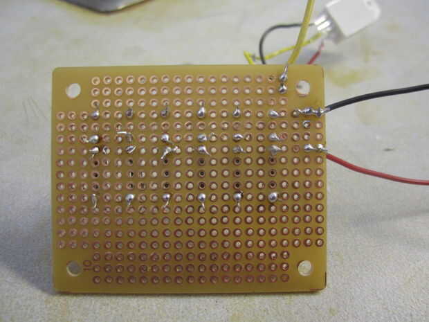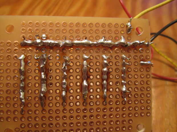 Asegúrese de que la polaridad de los LEDs se corresponden a la correcta. Si haz cambiados entonces no se encenderá para arriba y tendrás que desoldarlos y girar. Si no está seguro utilice el multímetro. Aquí es una rápida demostración video del multímetro. Después de soldar todos los componentes en el lugar que necesita para conectar entre sí todos los tierra (negativo) los pines de los LEDs como suelde el cable negativo del sensor en la misma fila. Los sensores positivos cable (rojo) y los datos amarillo hay que soldar en el tablero donde hay espacio para otro cable de color rojo y amarillo a soldar. Sólo puede conectar el cable rojo y amarillo directamente en el Arduino si desea. O puede agregar dos cables más que forma el sensor está soldado a la placa de circuito y el otro cable Conecte los cables del sensor en el tablero y el Arduino. Asegúrese de que usted no las clavijas positivas y negativas de los LEDs juntos de lo contrario no funcionará el circuito de la soldadura. Dejé un agujero extra en la junta entre las dos piernas para estar seguro.