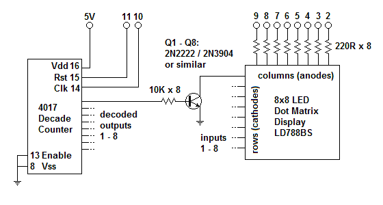 Ahora tenemos que montar el circuito para esta matriz. Consta de contador de década 4017. (Véase el diagrama) y ensamble el circuito. Muestra las conexiones para Arduino.