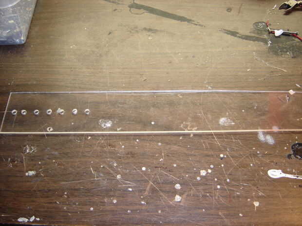 3. taladro 7 agujeros en una fin 3/4 de pulgada de separación para los LEDs. Me encontré con un tamaño que permite que el LEDs para presionar muy firmemente en los agujeros. Si había no encajan muy bien, yo habría utilizado un poco de pegamento caliente para mantener en su lugar.