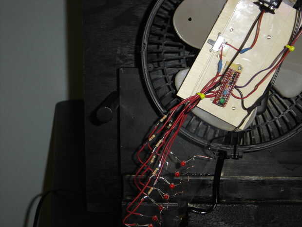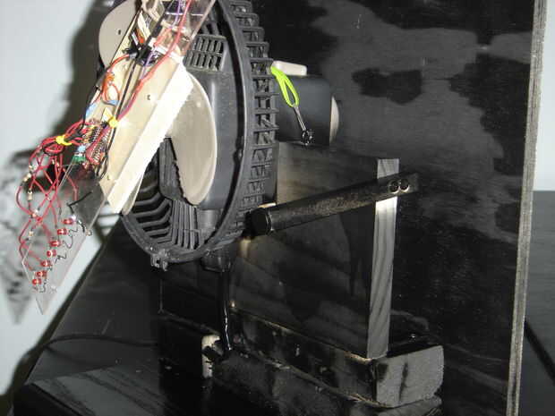 La batería de 9V debe colocarse donde actuará como un contrapeso para el plástico de giro. Si el plástico no es bastante bien equilibrado, sacudirá el ventilador todo cuando alcanza velocidad. Utilicé una combinación de goma y abrazaderas de alambre para sujetar en su lugar, pero aún pueden sacarlo si necesita reemplazo