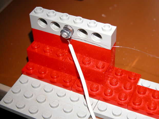 Comenzar con la construcción de la base más larga posible. Cuando se sentó en el centro, podrá llegar fácilmente a cualquiera de los extremos. Mina había construido de Lego - simplemente porque puedo. Luego estirar un trozo de alambre de nicrom en todo el ancho y terminar de atar cada extremo alrededor de un tornillo. Esto ayudará a disipar el calor que emite. Mantenga este cable enseñó. Mida la resistencia de este tramo de alambre, como esto le dará una idea como el rango y nivel de detalle, del instrumento. Mina fue 176 ohmios, a través de 1,2 metros.