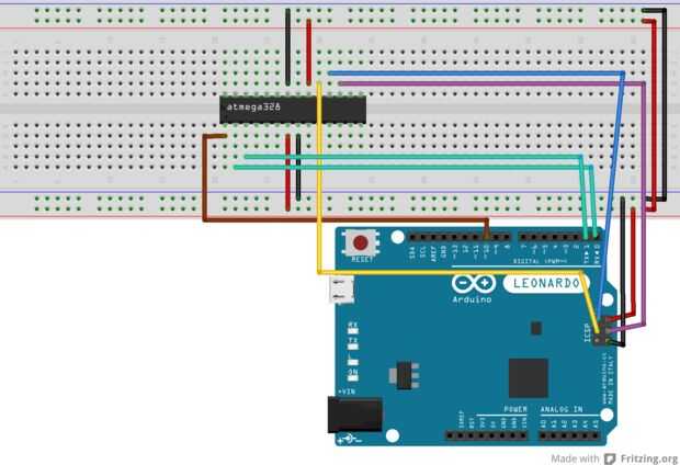 1 - Conecte los cables del Leonardo en el atmega328 (por favor, echa un vistazo a atmega328 pinouts son lo mismo con atmega168-imagen 1):