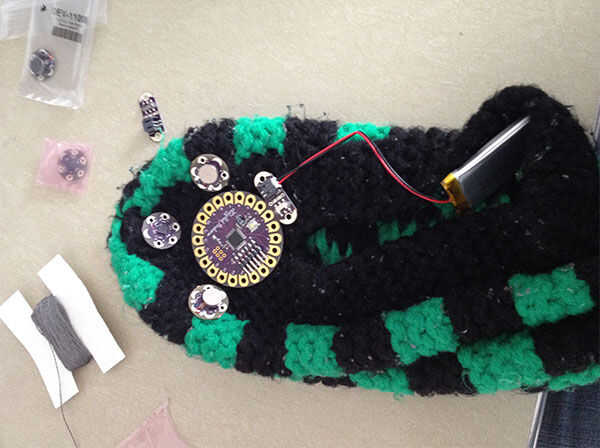 Hice un pequeño masajeador de pies deslizador automático con Lilypad Arduino y algunos de los consejos de Vibe Lilypad el masajeador real. El sensor que usa es un acelerómetro de Lilypad que estoy utilizando solamente como un sensor de inclinación básica. Esencialmente detecta cuando el deslizador está en una posición más vertical (como cuando patear los pies hacia arriba para relajarse) y luego enciende los motores. Cuando el deslizador está en una posición más horizontal (como cuando caminas), apagarán los motores.