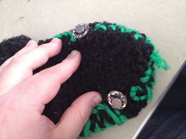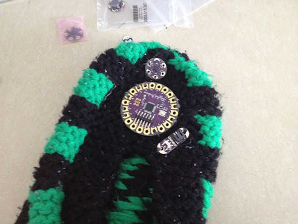 Tableros de ambiente: Hacer el ambiente tableros última puesto que tienen que ser cosido en la parte inferior de la zapatilla y es un poco de dolor al hacerlo. Encontré más fácil hacer la pantufla adentro hacia afuera y luego empezar con el pin negativo o positivo en el tablero de la onda (puede empezar con cualquier junta de vibe, no hace una diferencia). Una vez que he cosido el perno cerca de 3 veces, pega la aguja a través de la parte delantera de la zapatilla, asegurándose de que no está cerca de otro rastro, y luego voltear a la derecha del deslizador hacia fuera y entonces la cosa hasta el pin correcto en el Lilypad. Sólo repita estos pasos con ambas tarjetas para los pernos positivos y negativos.