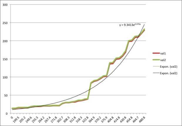 La forma más fácil para encontrar el umbral es conectar la báscula hasta el Arduino. Utilizando el ejemplo de leer serial desde el código de Arduino debe ser abundante. Puede tomar la parte de tensión y tomar el número de 0-1023. También ayuda a tener una escala está preparado o una buena variedad de pesos gramo a utilizar en la escala. Lo que buscas es el peso que el número Arduino consigue cambios por un valor de un gramo. Es posible obtener mayor precisión cuanto mayor sea el umbral, pero con la escala que utilizamos, esto fue lo mejor que podríamos obtener. Cada escala es probablemente diferente, pero es nuestra carta de calibración. Tiene una curva exponencial, así que basado fuera de que su umbral es donde la curva comienza a moverse hacia arriba más que hacia los lados.