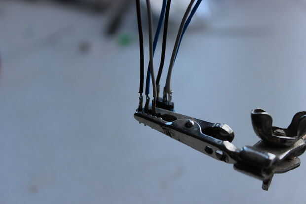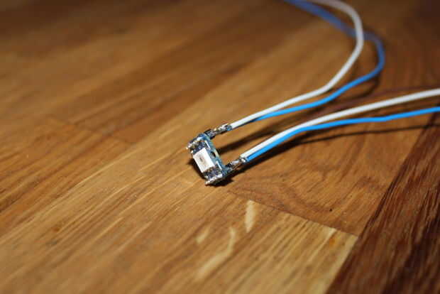El Neopixels tiene 3 cable que va y 3 salir. Tenía dónde etiquetados para adentro y hacia fuera y fueron el camino positivo y negativo. Soldadura con una longitud de 10 cm de cable a cada una de las entradas y salidas como se muestra en las fotos anteriores. (Tenga cuidado ya que son electrónicos sensibles, por lo que se requiere precaución la electricidad estática y precaución de calor)