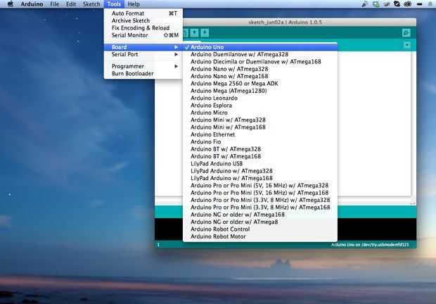 Una vez abierto, necesita especificar para la placa Arduino Uno. Ir a herramientas-tablero-Arduino Uno.