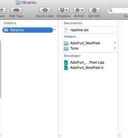 Entonces necesita instalar el tono y biblioteca (aro) de NeoPixel en Arduino para que el código se ejecutará.