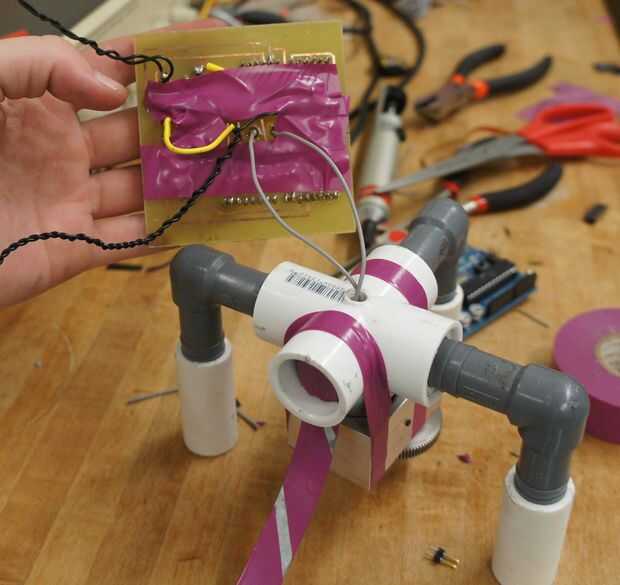 Mi Monte se basa en este diseño con algunas modificaciones (tenía acceso a algunas herramientas menos comunes a través de mi escuela, Pomona College). Me quedé con el diseño de PVC pues es ligero y portátil. Tuve acceso a un equipo que me permitió imprimir una placa de circuito, no tantos cables necesarios para rellenar en la carcasa. Después de soldar el circuito final, grabado en la parte inferior (que se enfrenta el arduino) para asegurarse de que nada toca el arduino que no supone. Mi motor no tiene reducción del engranaje incluida, así que construimos un conjunto de engranajes y una caja de engranajes de aluminio. El micrófono está asegurado en el extremo de la tira larga metal (cubierto en cinta rosa para la decoración).