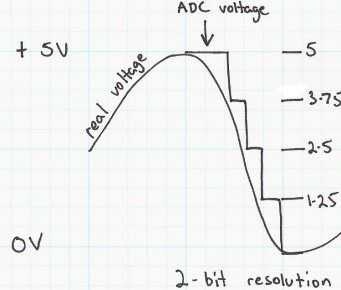 Toma un valor analógico (en este caso el voltaje a través de la LDR) y la convierte en una digital de 10 bit. Ya que tenemos 10 bits, la salida de la ADC va desde 0-1023 (es decir, 1024 valores 2 ^ 10). Cada voltaje entre 0 a 5V es asignado a un valor entre 0-1023. ¿Por qué hasta 1023? La razón es la resolución de nuestro ADC. Aquí representamos cada valor con una combinación de 10 bits. A medida que aumenta el número de bits utilizados para representar un valor, el valor de salida es mucho más preciso.