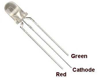 Marque la hoja de datos para su LED bicolor y seleccione un resistor para proporcionar la corriente correcta. Establecer la orientación de los conductores. El LED debe ser del tipo cátodo común.
