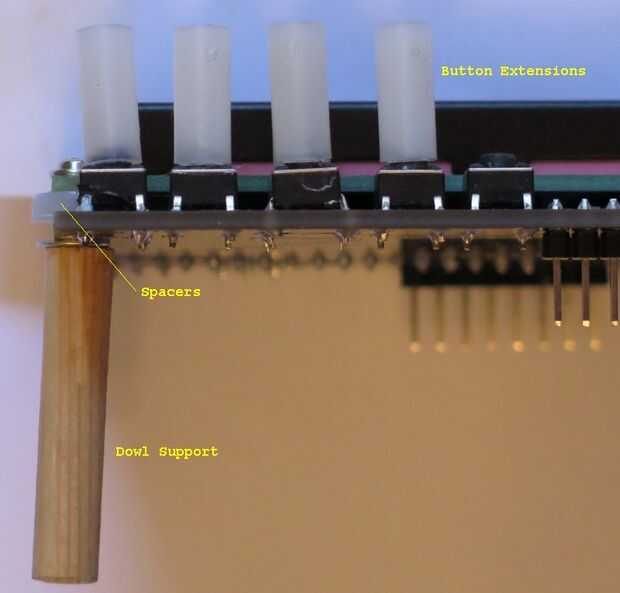 Encontrar el agujero de montaje en el tablero del lcd al lado de los botones. Con cuidado corte una pieza de la espiga de madera de 5mm para apoyar el extremo con botón de la pantalla LCD debajo del orificio de montaje. Debe apoyarse en el Banco. Esto detendrá la mecedora de lcd cuando se pulsen los botones.