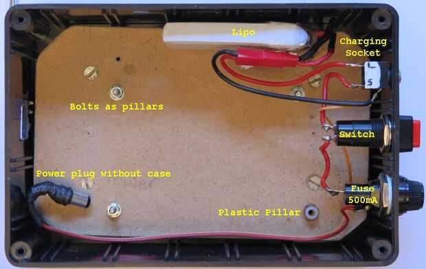 12) Quite el tornillo en caso de alivio de la tensión plástica de la clavija de 5.5 mm DC. Un par de cables a la red de terminales para la punta de la soldadura. Use tubo termoencogible para aislar y organizar los cables en una curva antes de calentar. Eliminación de la caja de alivio de tensión permite que el soporte de madera.