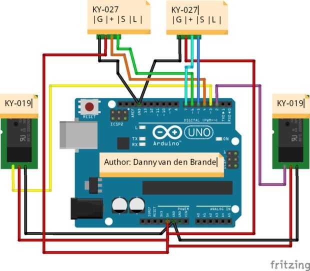 - Relé de 2 x 1 canal de KY-019 (puede utilizar un relé de 2 canales para).