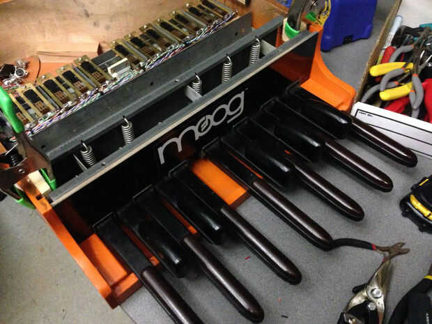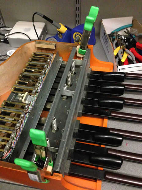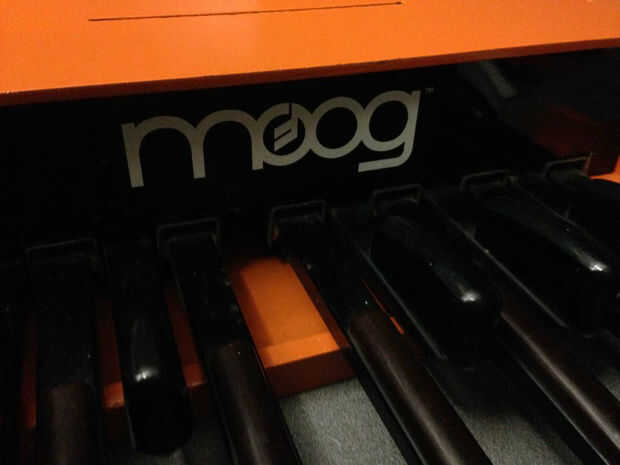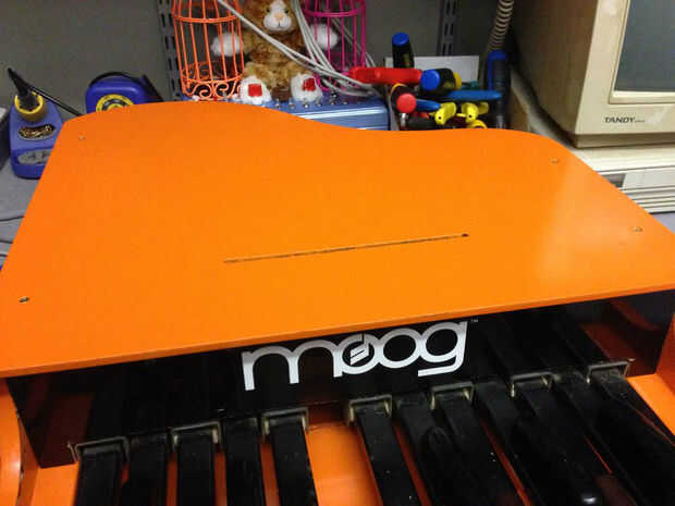 Para evitar la pintura la placa frontal, usé una pegatina para el parachoques Moog que consiguió durante su visita a la fábrica de Moog Music en Asheville, Carolina del norte. Era negro y mezclado en encubrir el antiguo logotipo de "Kiddy llaves". Se ve bastante decente y rinde homenaje a la original! Muescas en hacia fuera un pequeño rectángulo de madera de la parte inferior de la misma para encajar limpiamente sobre los pedales y adjunto 2 imanes en la parte posterior con pegamento. Se pega a la caja de metal de la Asamblea de pedal con los imanes.