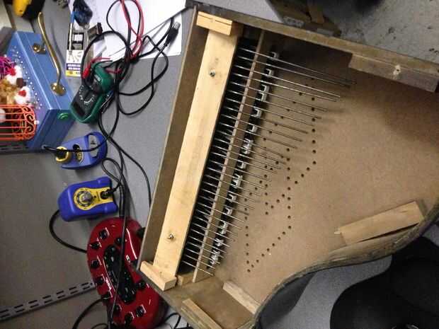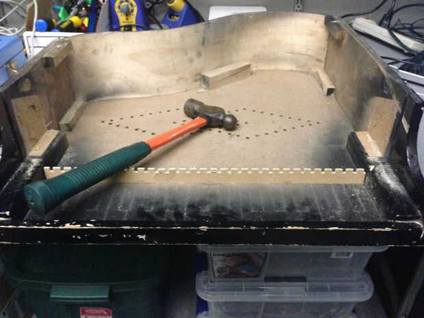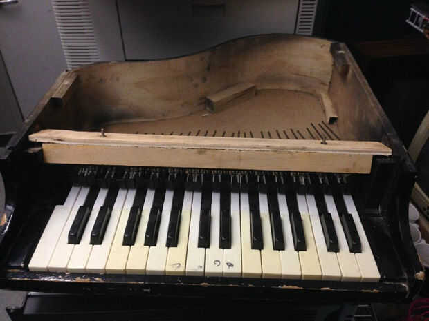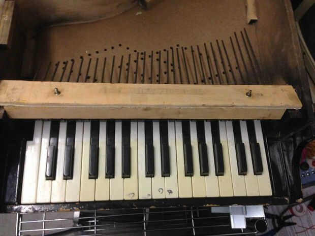 Después de quitar la tapa y la placa frontal "Kiddy llaves" y colocarla al lado, un par de tornillos y algunos clavos sujeta las varillas de metal. Las barras de metal fueron todos atadas a una tabla y salieron como una sola pieza, para salvarse de un proyecto más adelante. Las teclas de plástico y martillos flotaban en su lugar y sin contemplaciones se arrojaron a la basura.