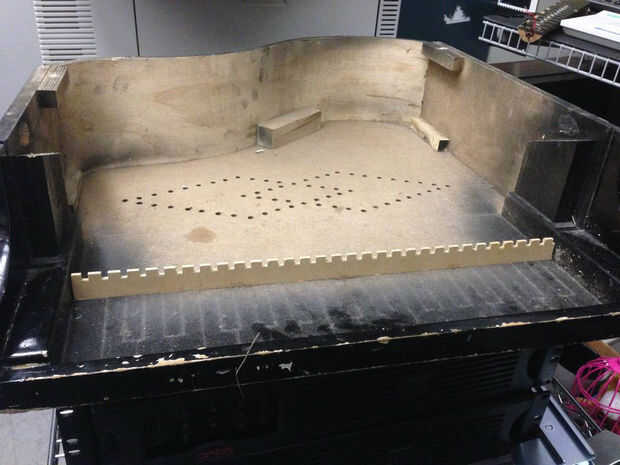 Esta izquierda un par de bloques de la mejilla del"" (para robar un término órgano) a la izquierda y la derecha que fueron forzadas hacia fuera con el destornillador y martillo. Los dientes madera que dependía de las teclas del piano se puedan fácilmente hacia fuera con unos alicates. Esto deja un espacio abierto y limpio agradable para poner los pedales.