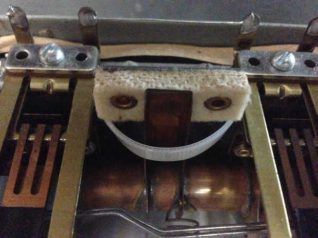 Cualquier pise y tenga en cuenta el brazo de pivote que se mueve contra el parachoques de fieltro situado entre los pedales E & F. Utilizando un ziptie de nylon a través de los ojales en el fieltro del parachoques, fije el brazo de pivote contra el parachoques que es inmóvil. Esto convertirá los contactos a la acción momentánea.