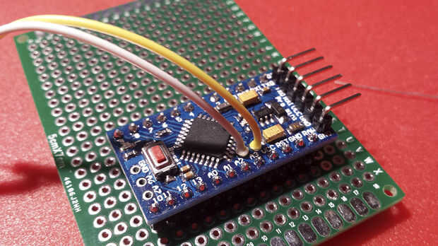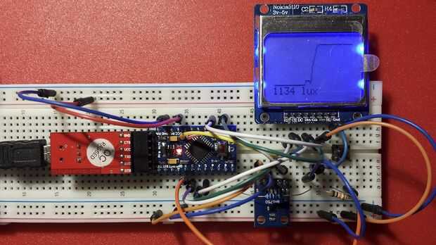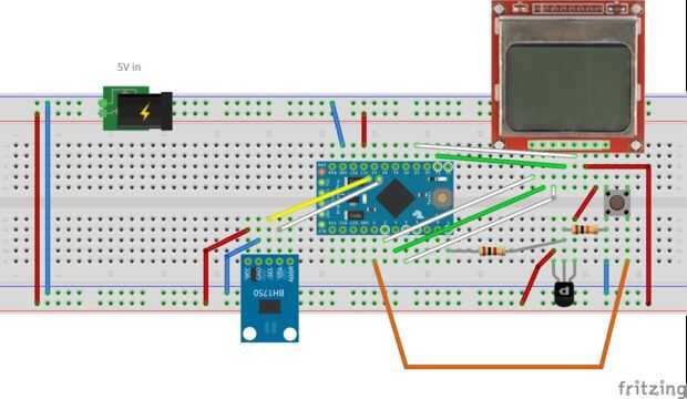 Primero construí el dispositivo en protoboard para probarlo. Esto es bastante sencillo, sólo tiene que conectar todo como ves en el diagrama de conexión. La única parte delicada son las patillas de I2C en el Mini Pro. He resuelto que por soldar dos trozos de alambre de tablero con los pernos, luego durante el montaje final serán sustituidos por una solución más permanente. Módulo de HB1750 entonces es fácil, sólo tiene que conectar SDA para A4 y SCL del perno a perno A5.