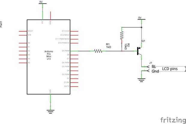 Si también desea que el control de contraluz automático, tienes que conectar un BC327 (o similar) PNP transistor al pin 9 como se muestra en la última foto de Arduino. Esto atenúa automáticamente la luz de fondo si el medidor de luz está por encima de cierto valor, para preservar la batería. Si no desea esto, sólo tiene que conectar el pin BL de la pantalla LCD a + 5V y sólo permanecerá encendido todo el tiempo.
