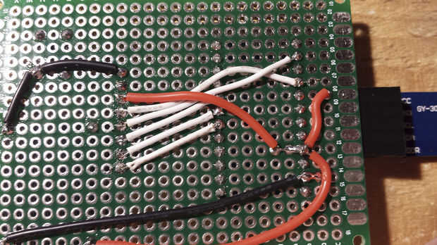 Empecé por el enrutamiento de los cables de alimentación. Conecté el cable VCC a en + del módulo TP4056 - simplemente esto proporcionará las pruebas iniciales + 5V de lo USB. En este punto, VCC y GND fueron conectados a los respectivos pines VCC y GND de Arduino, el módulo de HB1750 y la pantalla LCD. También, un lado del botón fue conectado a GND. Entonces cableado todas las conexiones de datos del LCD con el cable blanco, según el cableado que se ha descrito anteriormente. No se muestra en estas fotos, también conectado el pulsador al pin 2 de Arduino.