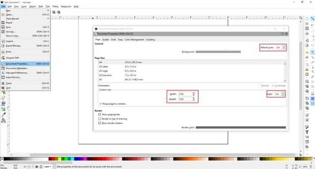 Abrir el Inkscape, ir al menú Archivo y haga clic en "Propiedades del documento". Ver la imagen 1 de arriba y hacer los cambios, asegúrese de cambiar primero a "cm". Ahora cierre esta ventana. Vamos a utilizar el área dentro de 4 a 8 cm. Ver la 2ª imagen de arriba.