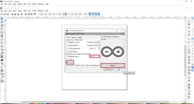 Esto es más difícil que los textos. Imágenes deberán tener un fondo transparente. Arrastrar y soltar la imagen en Inkscape. Haga clic en aceptar en la ventana siguiente. Ahora tienes que cambiar el tamaño la imagen para ajustar el área de impresión, vea la imagen 4. Haga clic en ruta de menú y "Trazar mapa de bits". Realizar cambios como la 5 º imagen de arriba. Haga clic en aceptar y cierre la ventana. Ahora, mover la imagen de escala de grises y eliminar el color uno detrás de él. Mueva la imagen gris al lugar correcto otra vez y haga clic en menú trazado "objeto de camino". La imagen 6 muestra cómo borrar el contorno de la imagen.