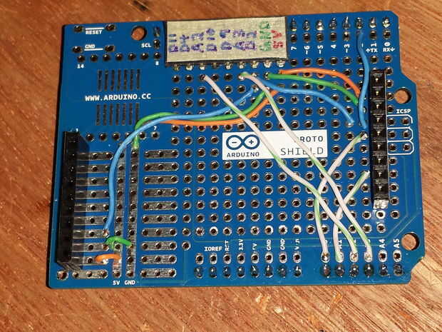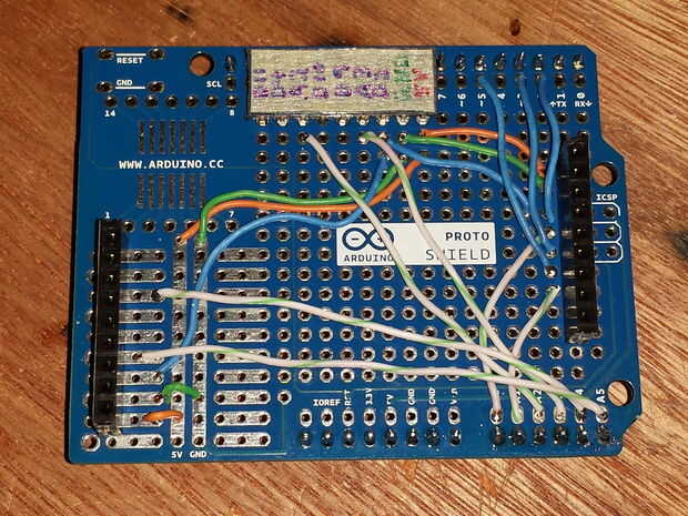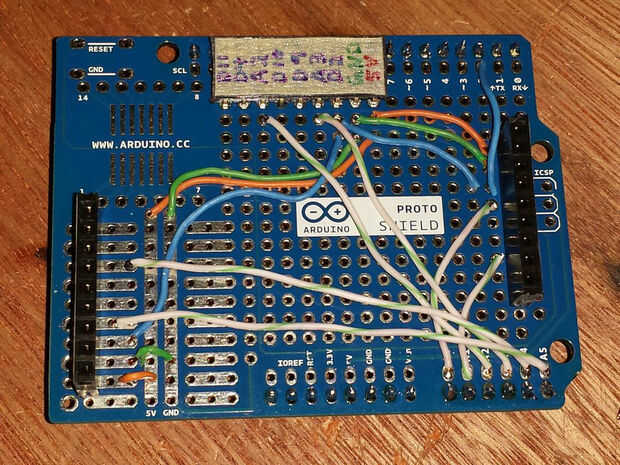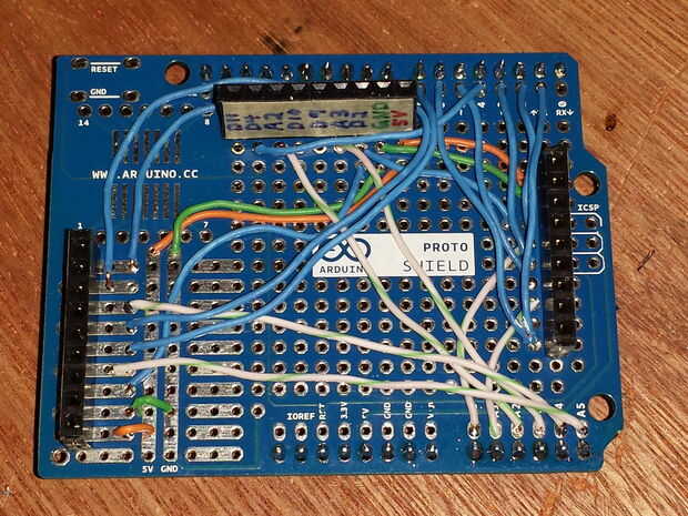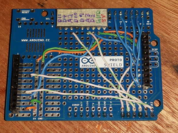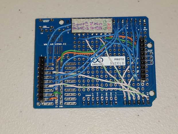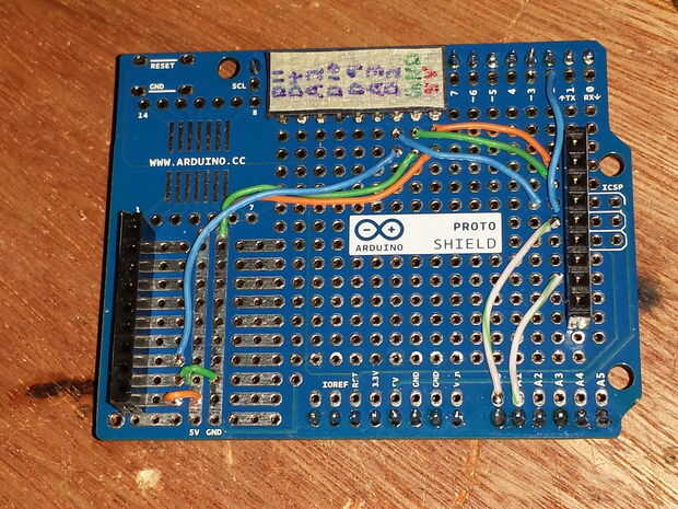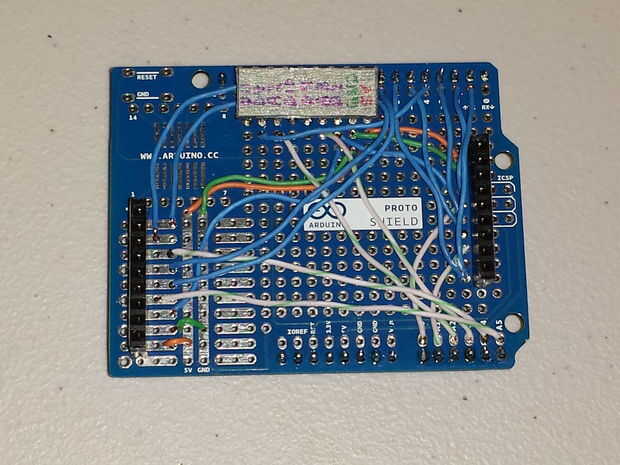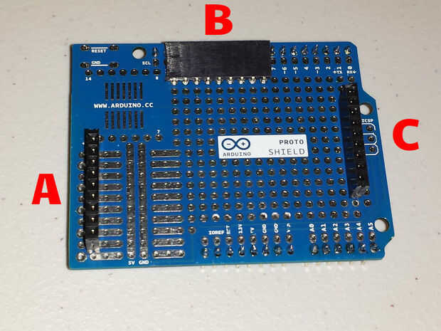 Cuando puse hacia fuera los pernos, tuve que pensar sobre qué tipo de mini escudos irían donde. El escudo pequeño de RTC debe tener pines analógicos A4 y A5 porque ellos aare requerida por la biblioteca. Mi LED RGB y Theremin mini-los protectores de ambos necesitan 3 pines capaces de PWM, y puesto que la ONU tiene 6 pines PWM, me gustaría utilizar 3 para escudo B y 3 para escudo C. Mi escudo mini botón debounced necesita tener pin digital D2 o D3 para acceder a la interrupción de hardware, ya que D3 también es un pin PWM, decidí usar D2. Ya que realmente solo necesita esto para 1 escudo ahora mismo, y no puedo imaginar que necesitan 2 escudos interrupción, decidí conectar el D2 en todos los puertos de 3 mini protector.