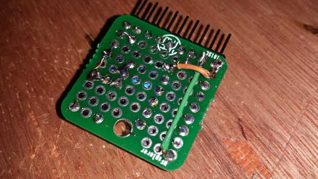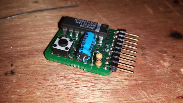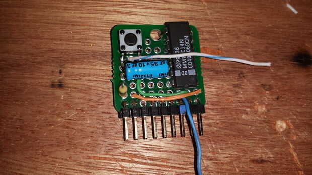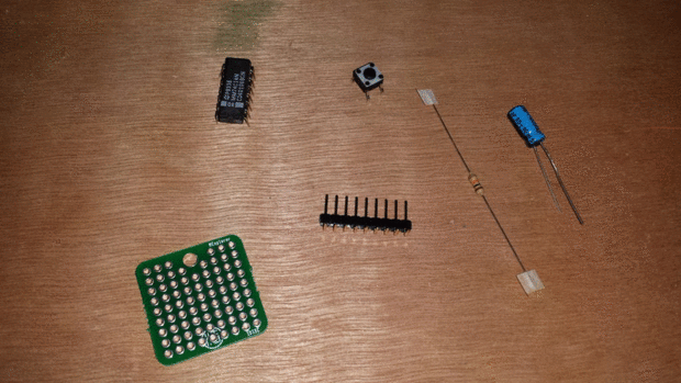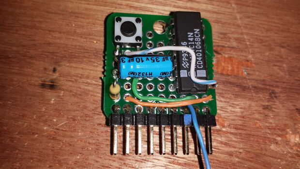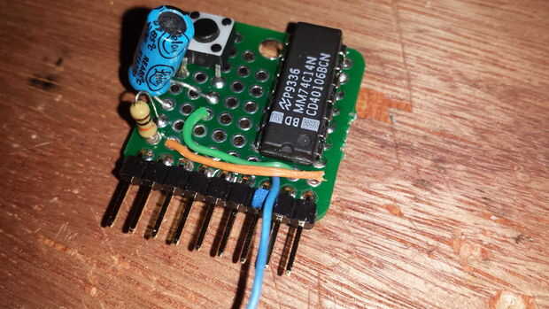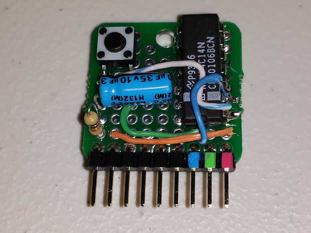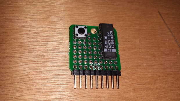 Otra de estas tarjetas de 9 x 9 por-agujero plateado proto tuve así que pensé que haría otro módulo que podría utilizar en el mismo puerto. Tengo una sección de uno de mis breadboards dedicadas a un conmutador de hardware debounced. De esta manera puedo enganchar el interruptor hasta la interrupción de hardware Arduino y comenzar una nueva instrucción en medio de un bucle. Los pines de interrupción deben ser debounced con hardware porque no es posible utilizar el retraso espera debounce en la interrupción.