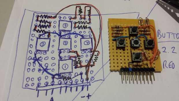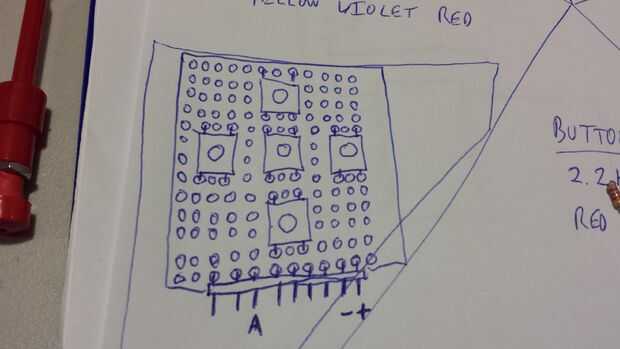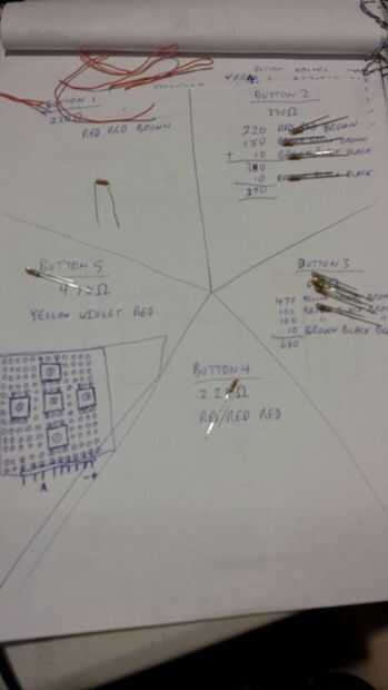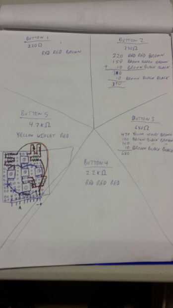 Estaba tratando de utilizar piezas que tenía en la mano y estaba quedando sin botones, así que tuve que salvar 4 de estos botones de panel de control de la unidad de aire acondicionado. Tengo un conjunto de resistencias estándar de Radioshack que está superando un poco recogido, pero aún pude hacer algo trabajar combinando unas resistencias para obtener la resistencia deseada.