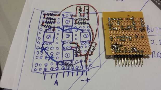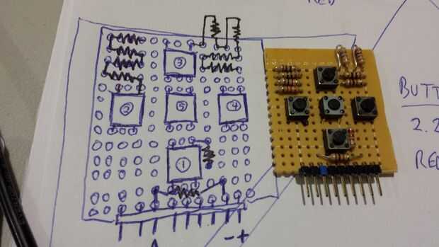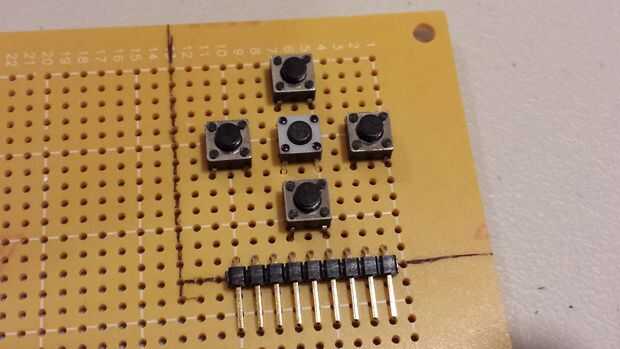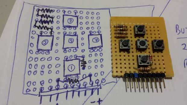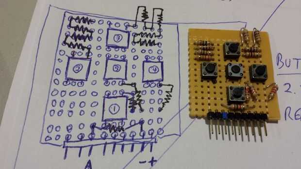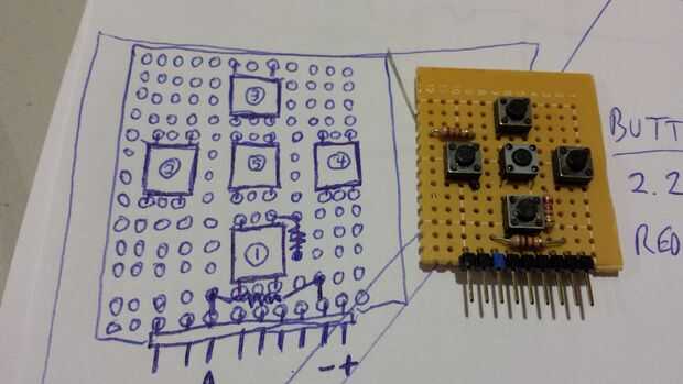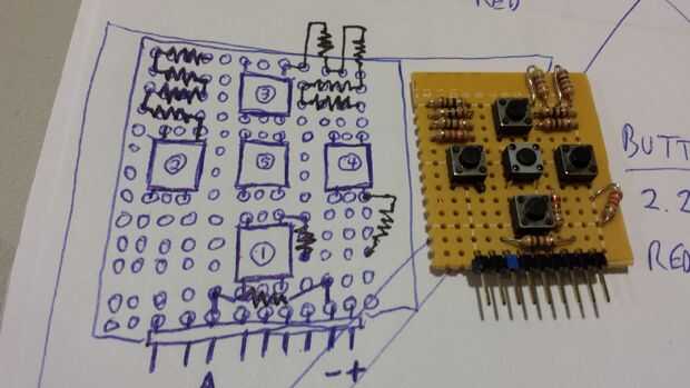 Puesto que la idea original era agregar algunos nuevos insumos para mi proyecto de escudo de tiempo y temperatura, pensé que sería bueno un pad direccional. Me acordé de este post en la página de Arduino que usa sólo 1 pin análogo para todos los botones. Porque las resistencias son trazadas tan bien, incluso permite la Arduino a reconocer combinaciones de cualquier 2 teclas pulsadas al mismo tiempo.