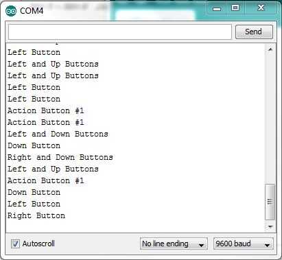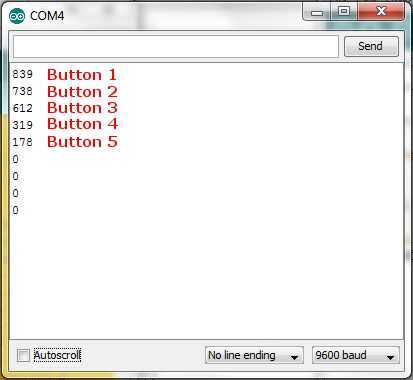 Tuve que usar 4 resistencias para botones de 2 y 3 para hacer los valores 390 y 680 descritos en este ejemplo, y como resultado mi resistencia real era ligeramente diferente, así que tuve que ejecutar el siguiente código de prueba para ver lo que la lectura analógica para cada botón y actualizar la matriz de botón para permitir que estos valores (generalmente 1 número arriba/abajo el ejemplo en la página de Arduino).