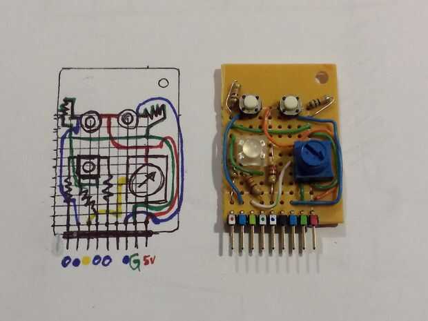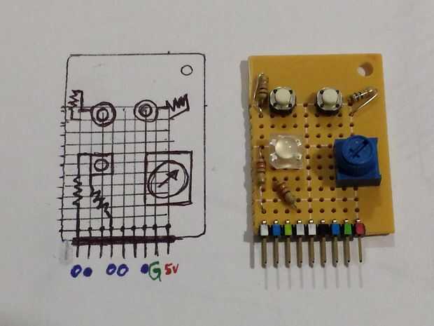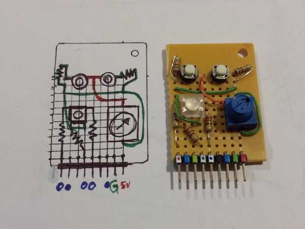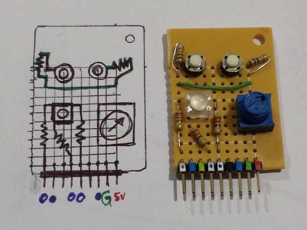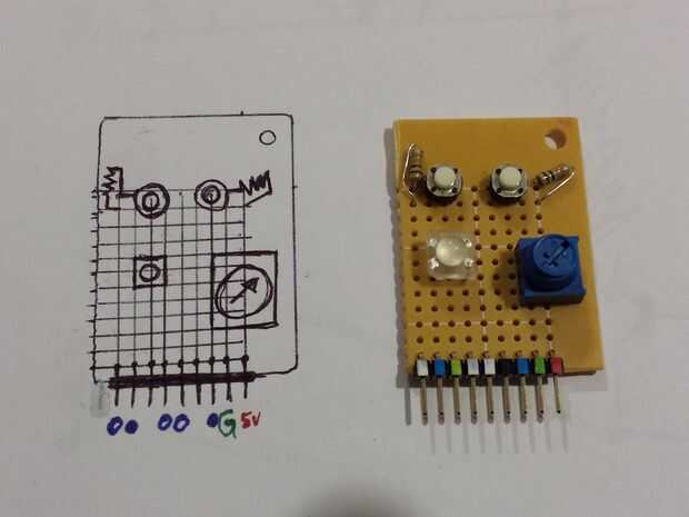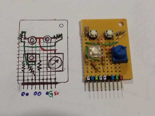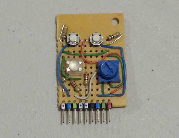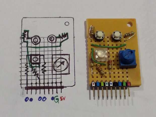 Tengo unos cuantos tipos de color completo RGB LED que me enganche de vez en cuando para arriba en un protoboard, pero cuando necesito espacio en un protoboard ir hacia atrás en un cajón. Pensé que uno de ellos podría hacer un buena mini escudo. Para el resto del espacio, he incluido algunos botones más y un potenciómetro porque siempre son muy útiles.