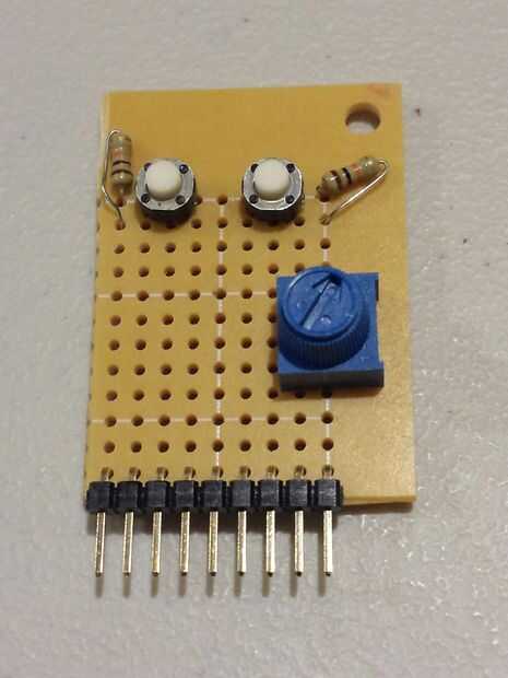Soldar el LED, los 2 interruptores y el 10 k condensador de ajuste del pote a la Junta de perf primero, luego trabajé en la adición de otras piezas. Até los cables de 5v y tierra lleva juntos y trabajado en atar los LEDs y cambia a los pines digitales y el limpiador del potenciómetro a uno de los pines analógicos. Si había pensado sobre esto, habría invertido la polaridad en el potenciómetro, porque tengo que girar la perilla hacia la derecha para disminuir y la izquierda para aumentar, que es comunmente confundida.