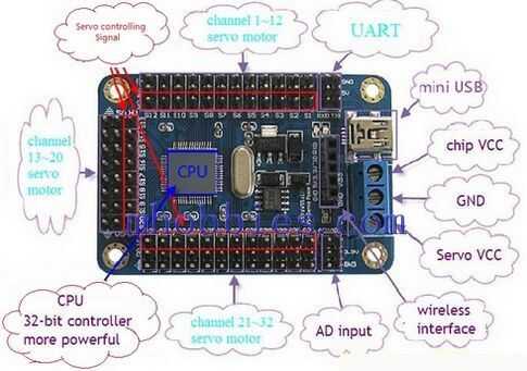 Este es el tablero de regulador recién actualizado. Hasta 24 motores servo puede ser controlado al mismo tiempo, ya sea mediante el uso de un software en un PC, o comunicación UART (puerto serie TTL) de MCU (51, AVR, ARM, FPGA, PIC, etc.) para enviar comandos para controlar la dirección. También podemos descargar las instrucciones para el controlador del motor servo para operación fuera de línea. Software (en inglés) se envía por correo electrónico después de la compra.