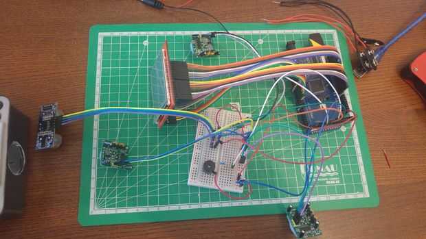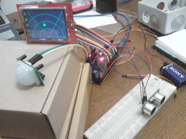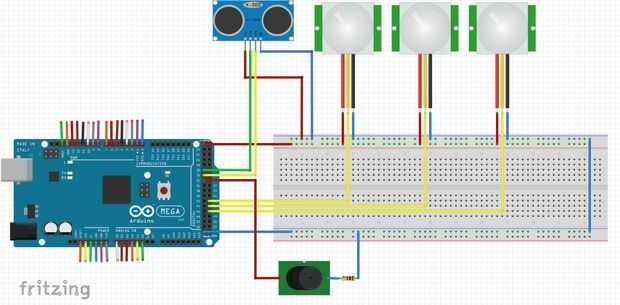 El plan era un dispositivo lo puede Detección de movimiento en tres vías diferentes, por lo que necesitaba tres sensores de movimiento PIR en los tres lados diferentes del dispositivo. Y un módulo de distancia por ultrasonido en la parte delantera. Para los sensores he utilizado una parte de la mini protoboard común 5V y GND común. Y uno de cable del clip de 9V soldada al interruptor de palanca por lo que yo puedo convertirlo ON/OFF. Soldado un resisitor de 100 ohmios para el zumbador piezo proteger la placa arduino. Tuve que usar un arduino MEGA debido a la pantalla necesita una gran cantidad de pernos y un UNO no tiene lo suficiente para la pantalla y los sensores. Bueno para saber el alcance del sensor de ultrasonidos es cerca de 4 metros y alcance máximo del sensor de movimiento PIR es cerca de 7 metros. Pero se pueden modificar la gama del sensor del PIR y el tiempo de retardo con el potenciómetro 2 pequeños en el sensor. En la primera foto puedes ver hay un montón de cable puente así que loco un cuadro esquemático con fritzing. Hace más fácil conectar correctamente los sensores:)